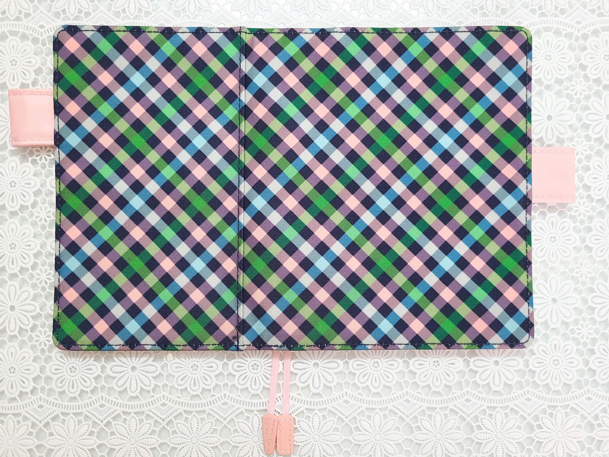 Navy, green, blue, and pink are the primary colors of this plaid design. The semitransparent spots where they intersect make for a complex color scheme anyone can enjoy.