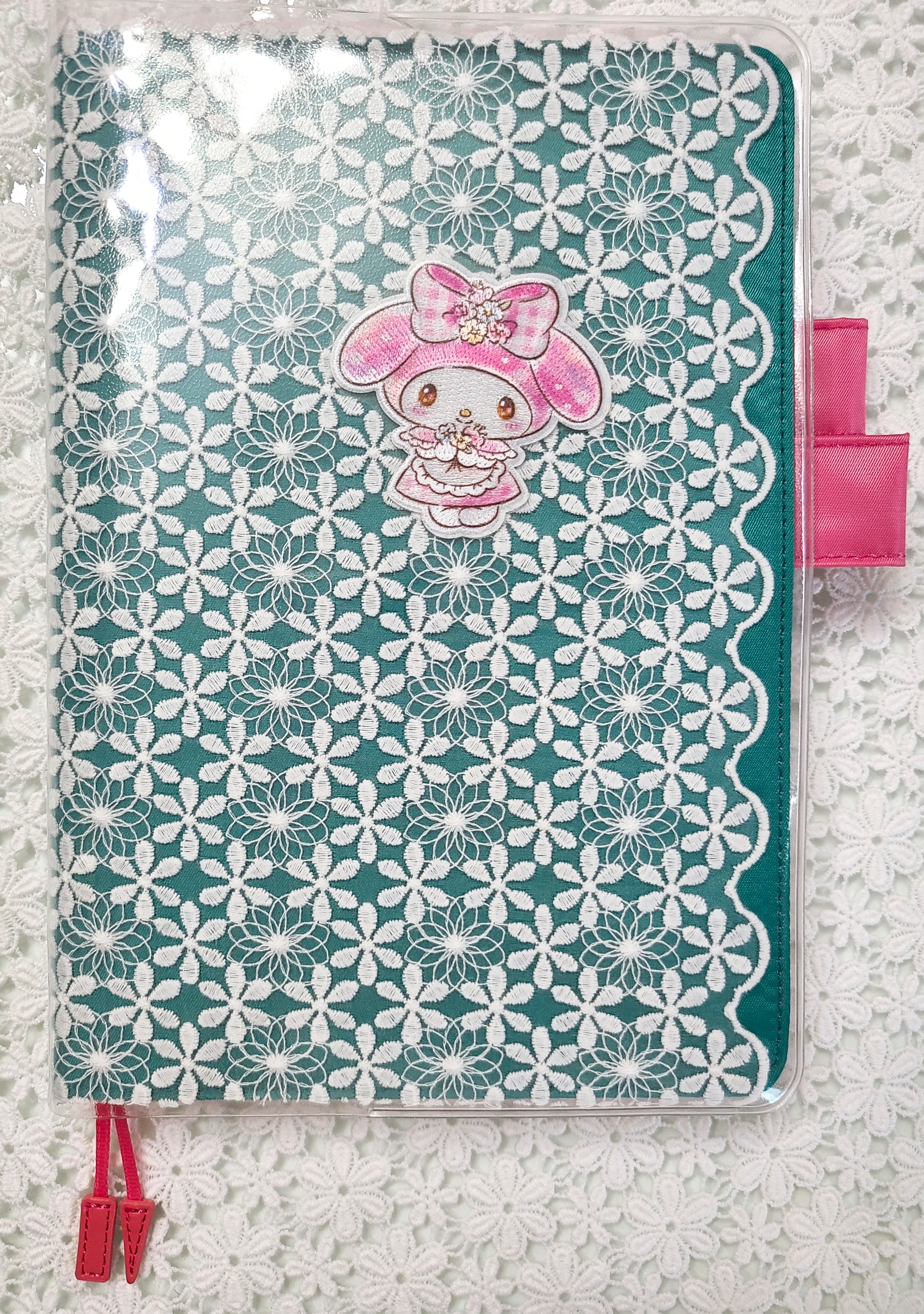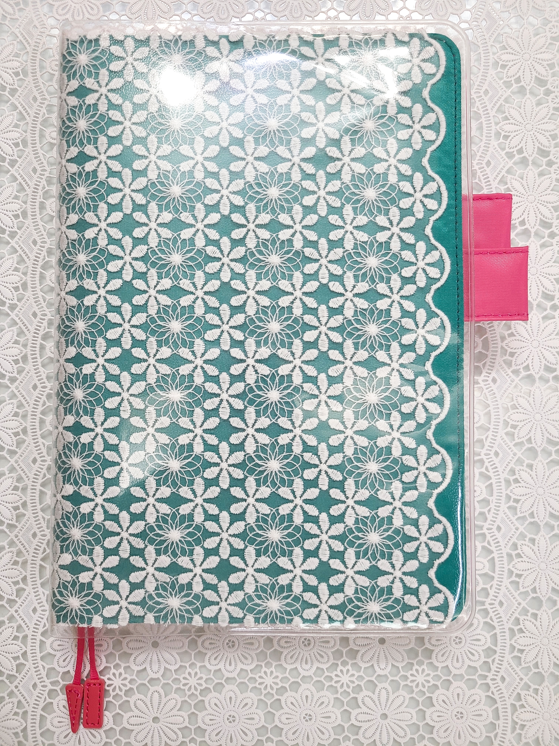 The pen holders act as a hinge, keeping the cover safely shut while you store a pen inside. The cover contains two bookmarks, one with a rectangle charm and one with a triangle charm, so you can keep your place in two parts of the book, such as the monthly calendar and the daily page.