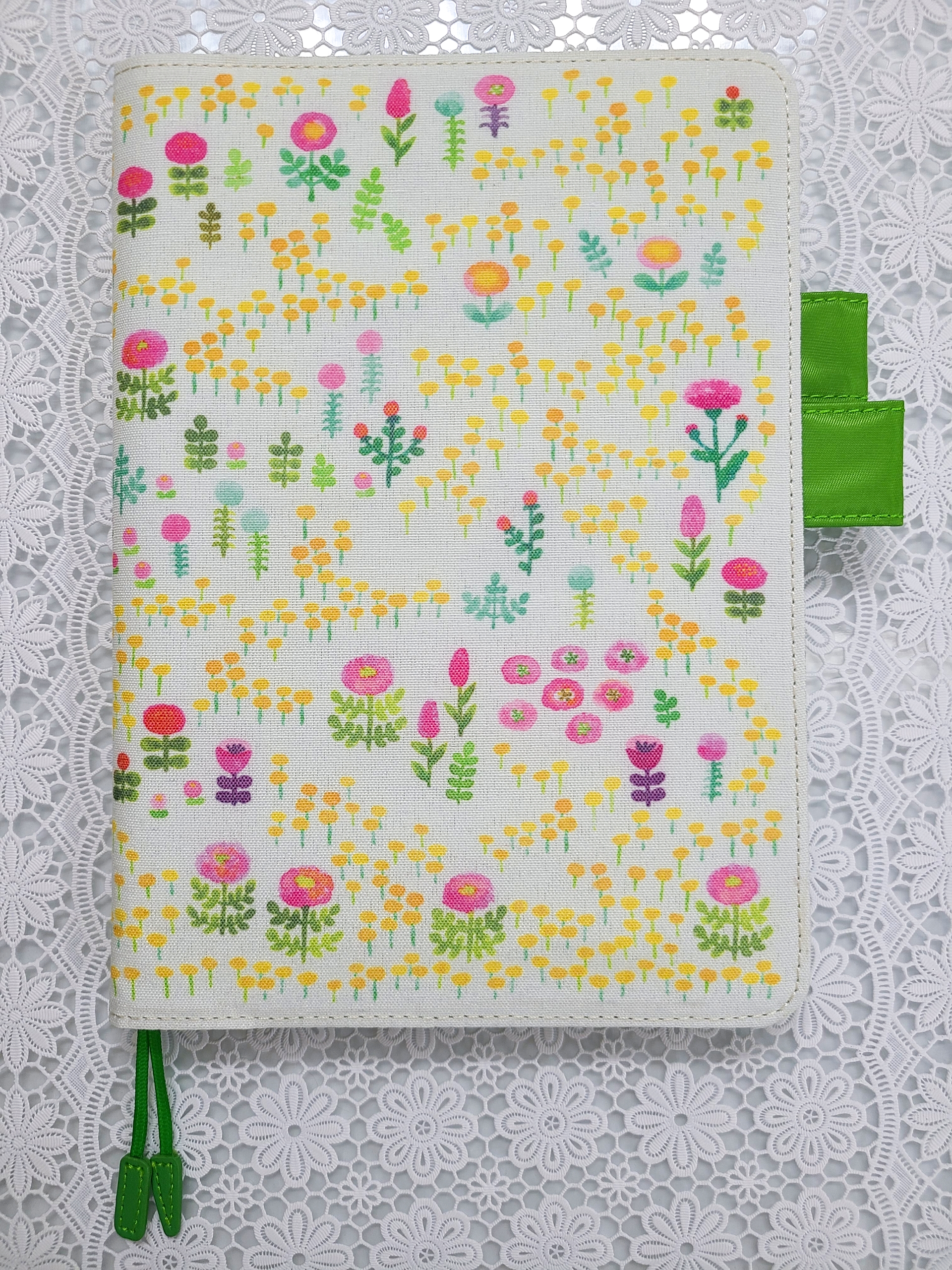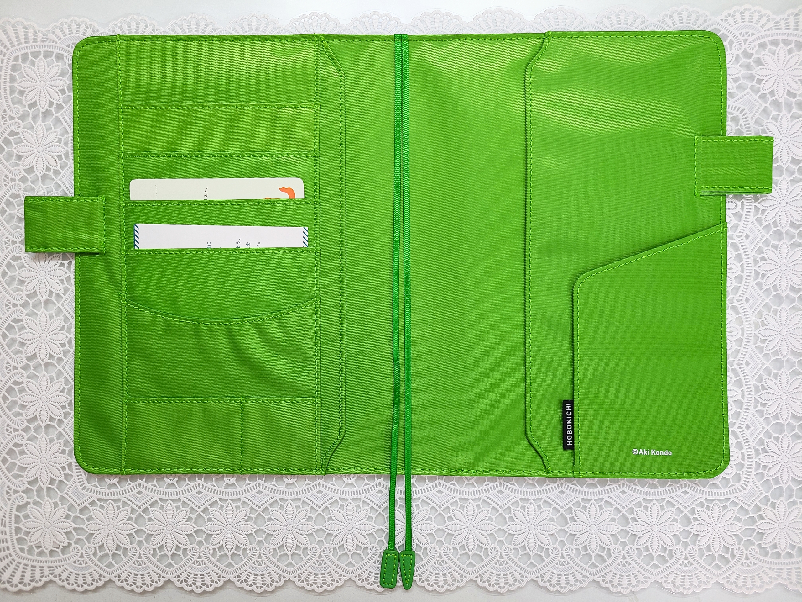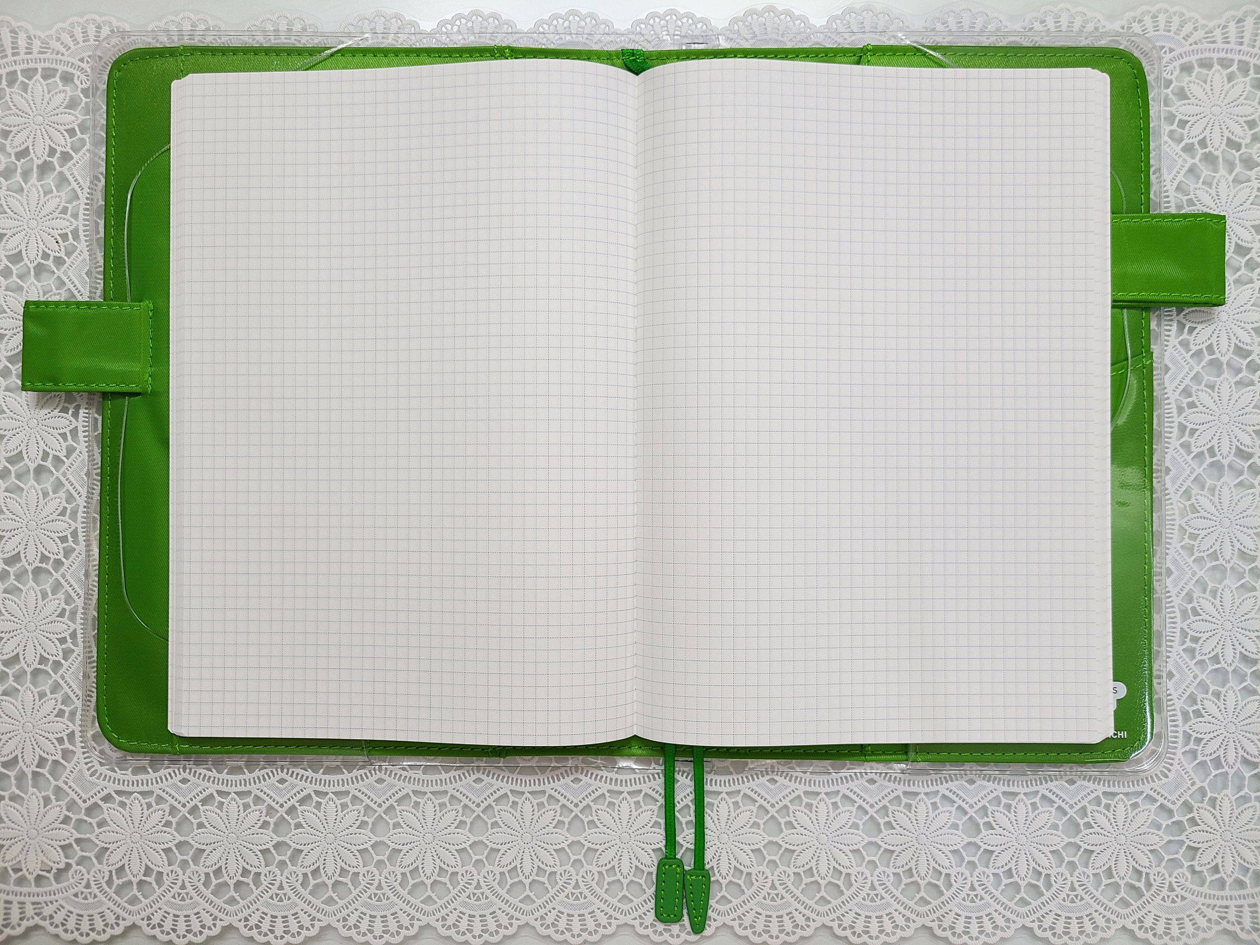 The interior, pen holders and bookmarks are a fresh light green.