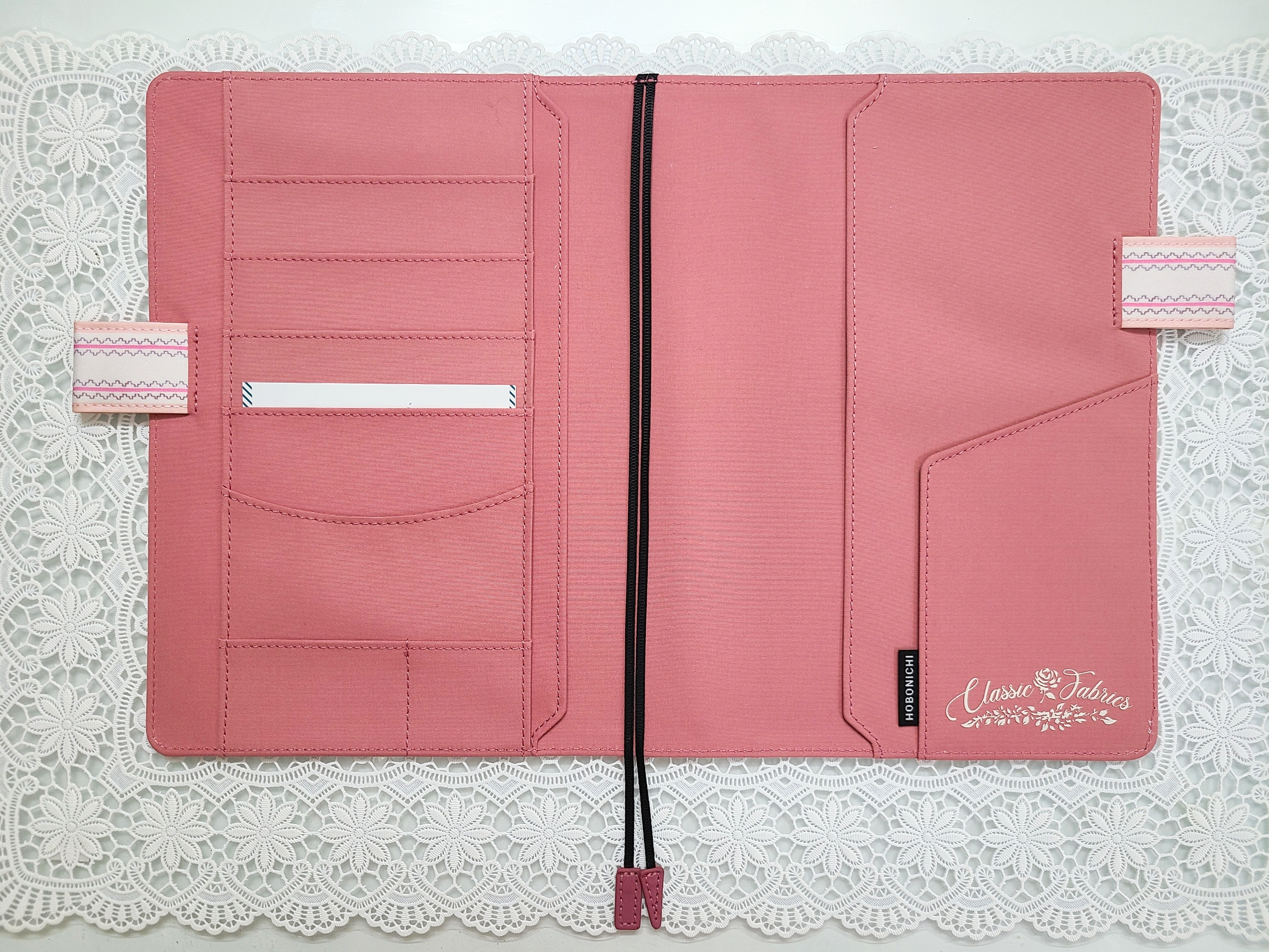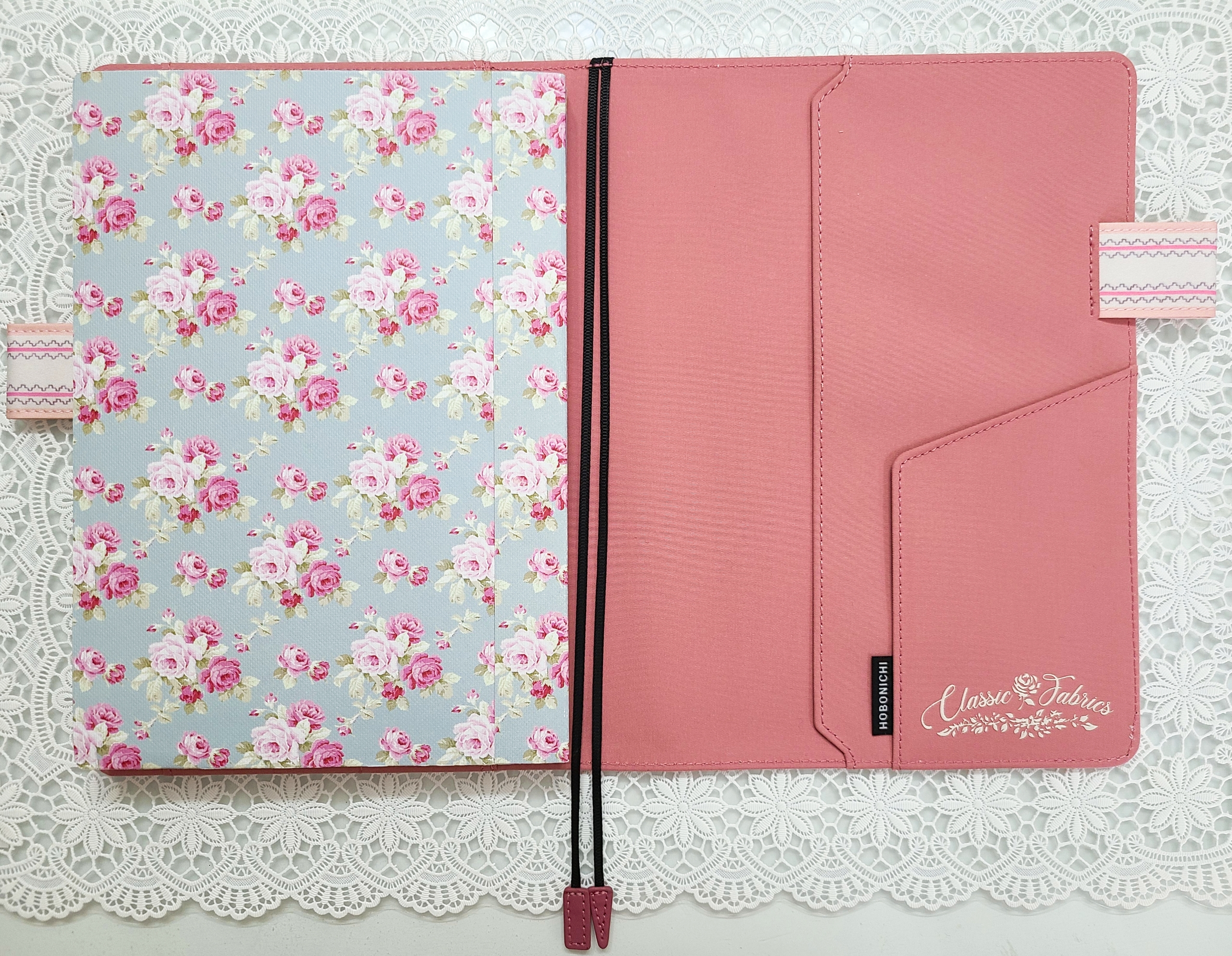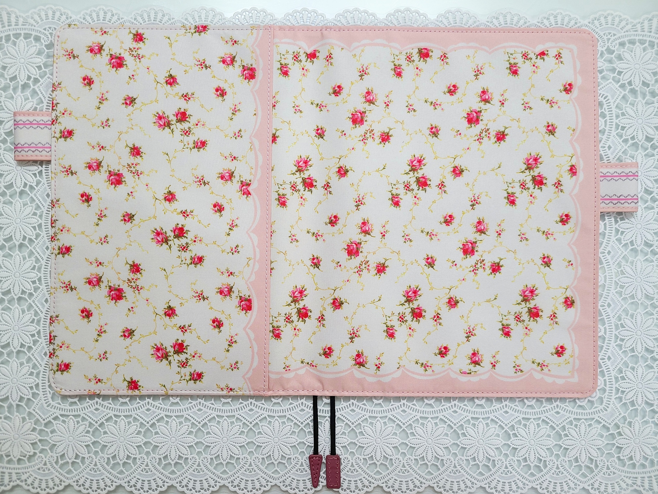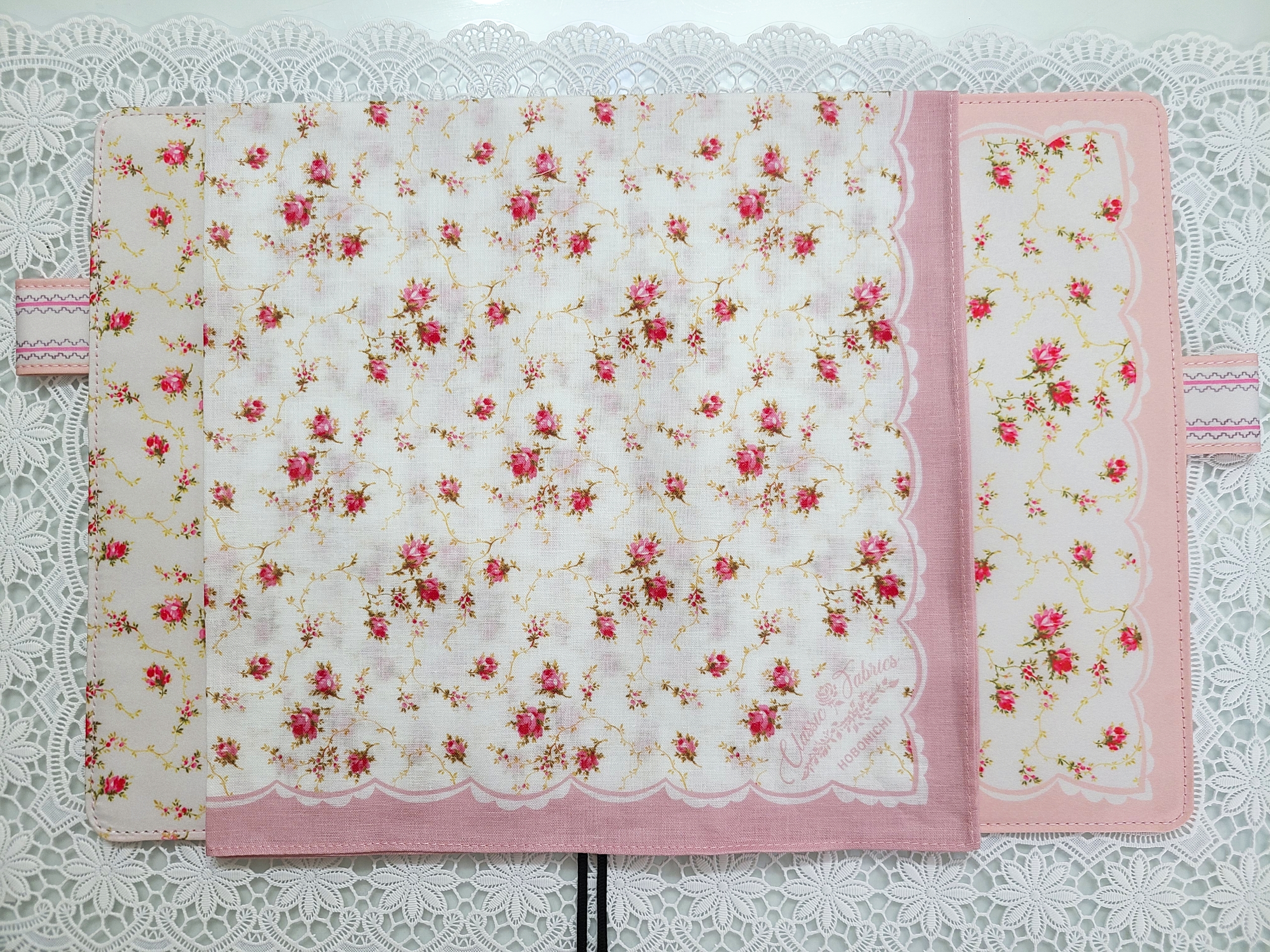 The pink scallop pattern framing the cover brings out the cuteness even more. The “butterfly-stopper” pen holders use a pattern from a different textile.