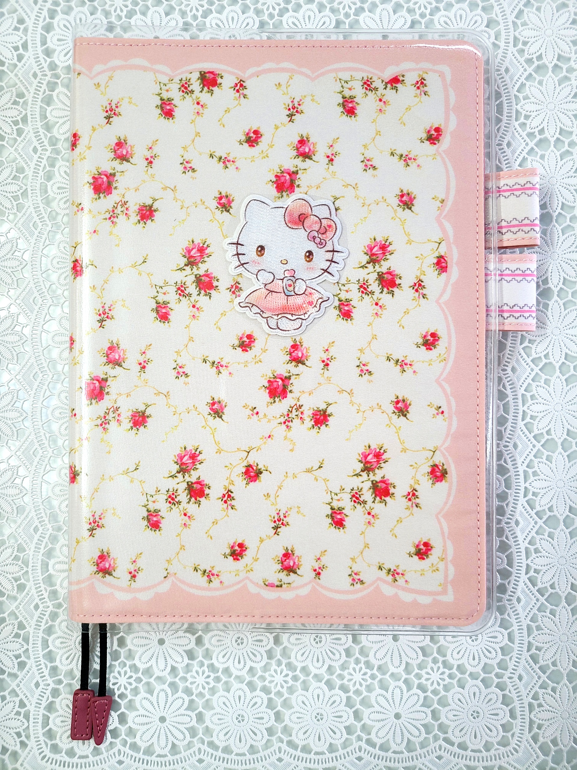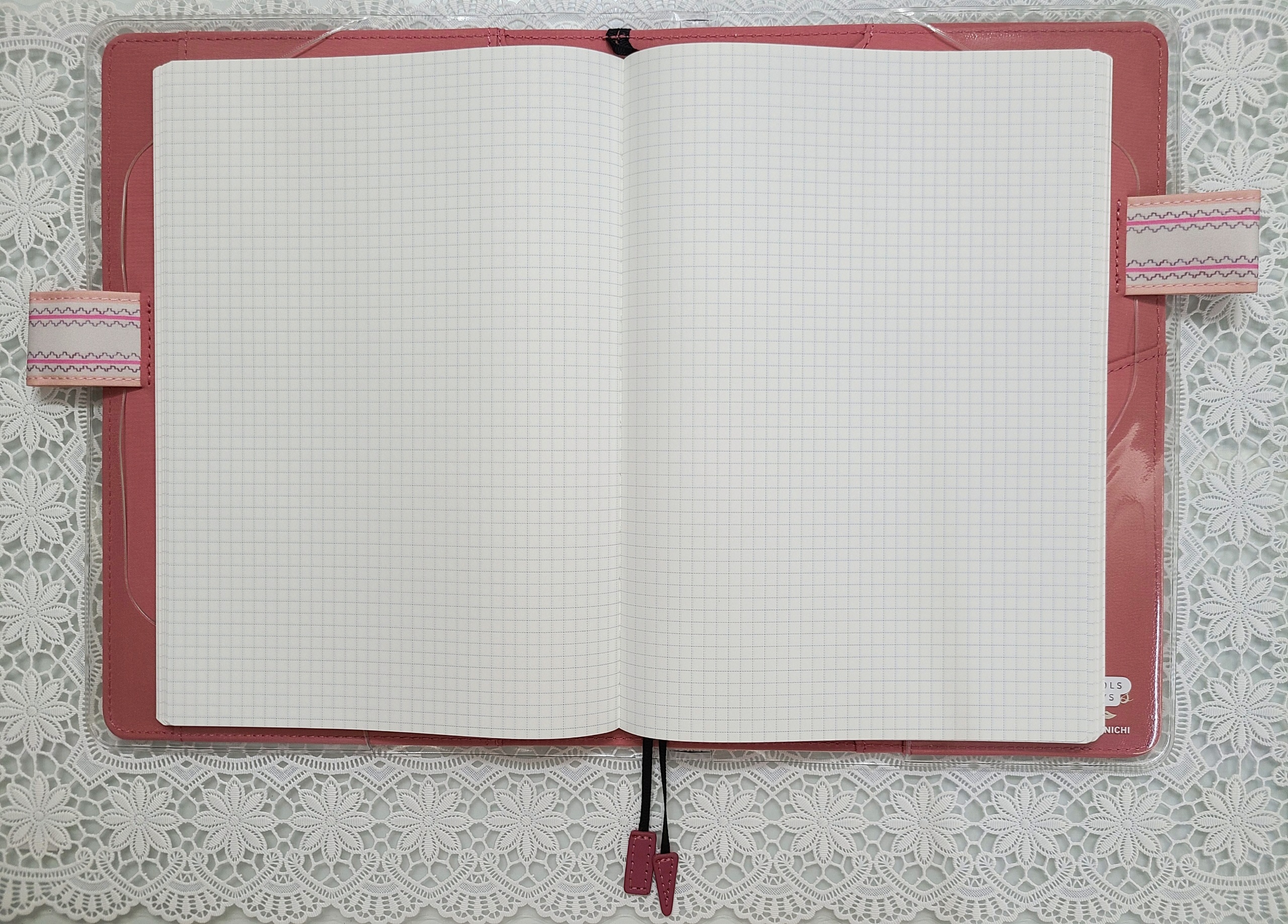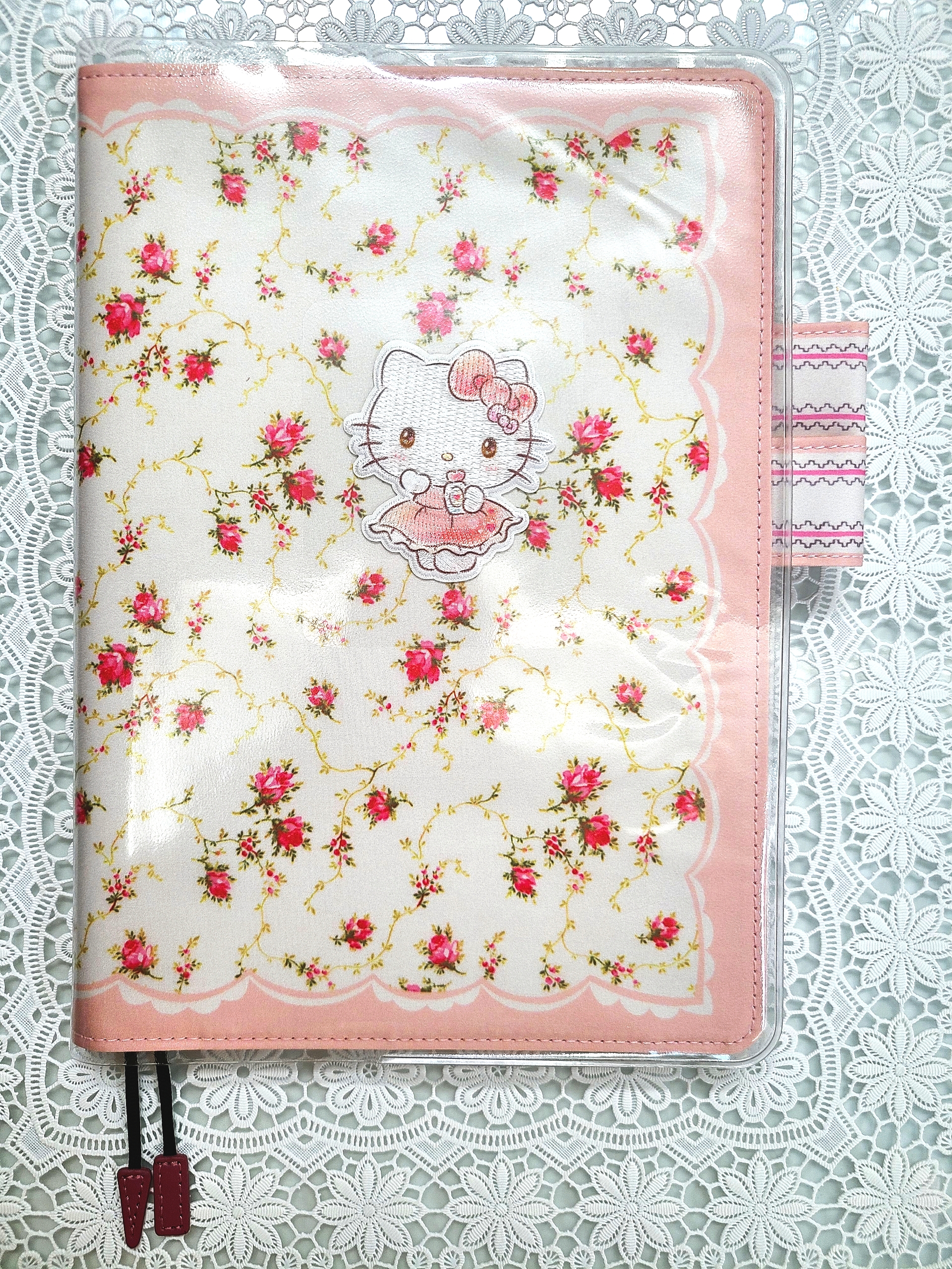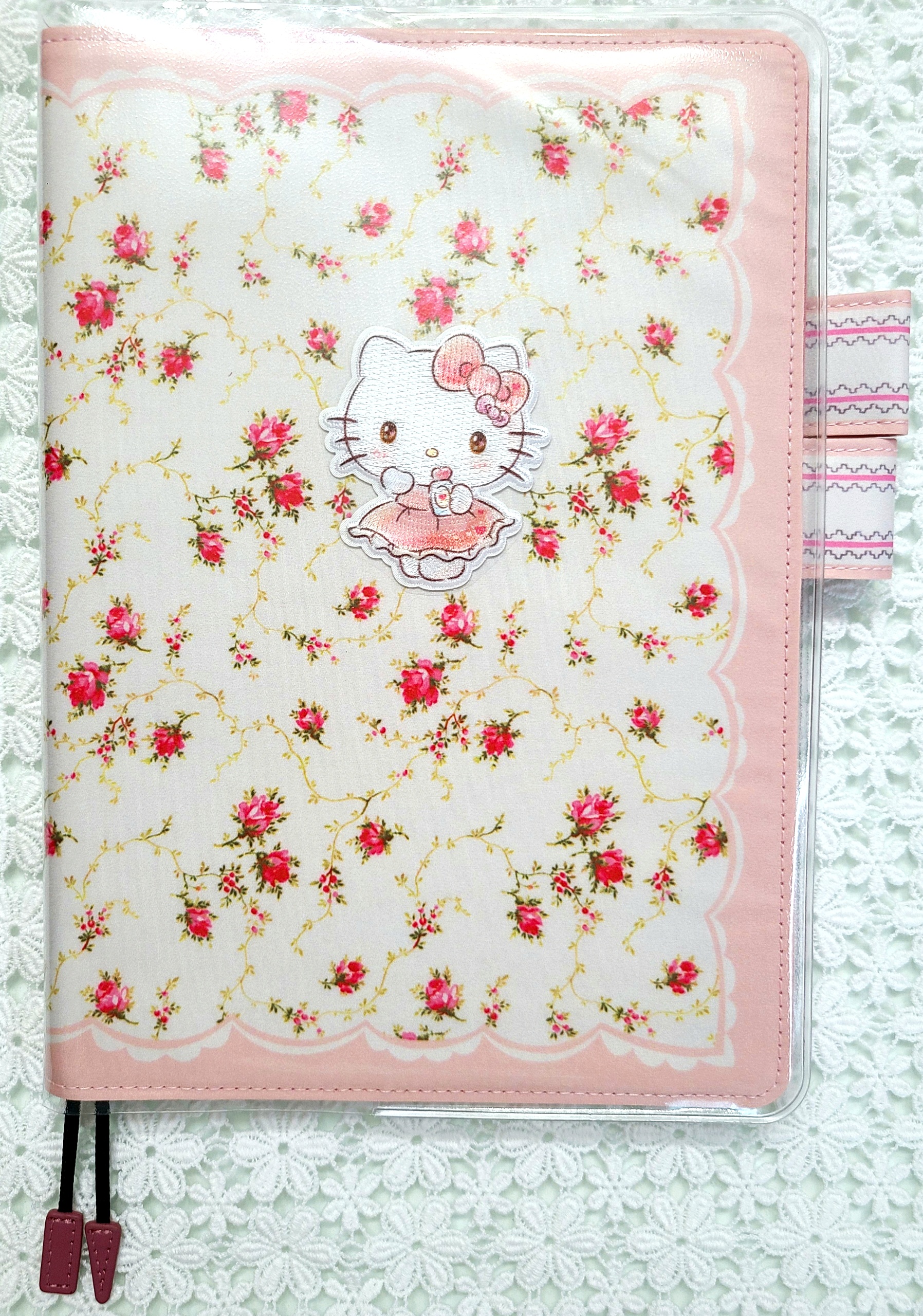 The pink scallop pattern framing the cover brings out the cuteness even more. The “butterfly-stopper” pen holders use a pattern from a different textile.