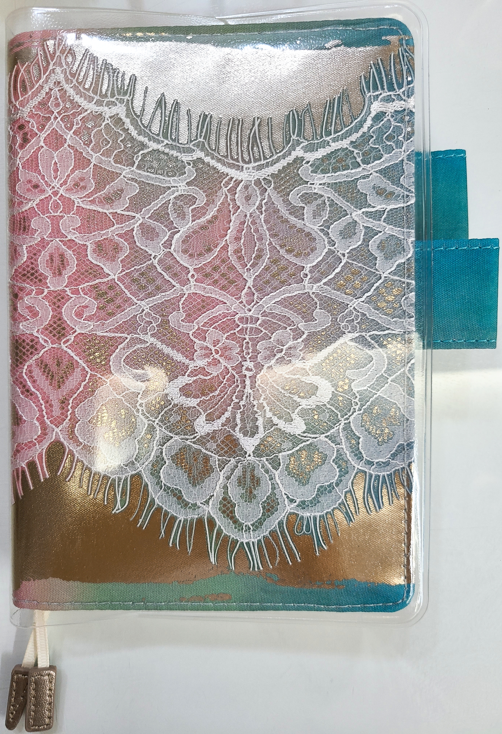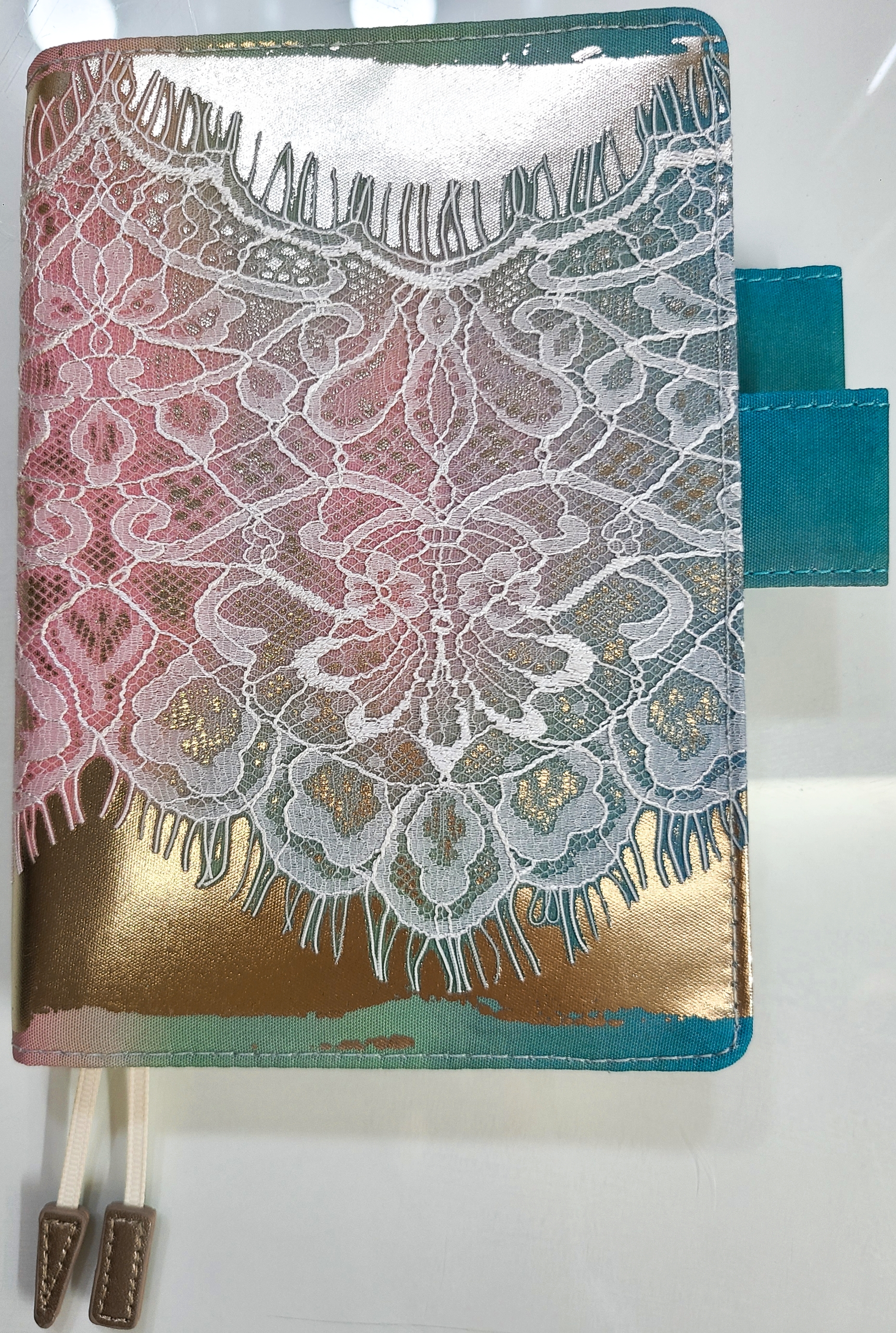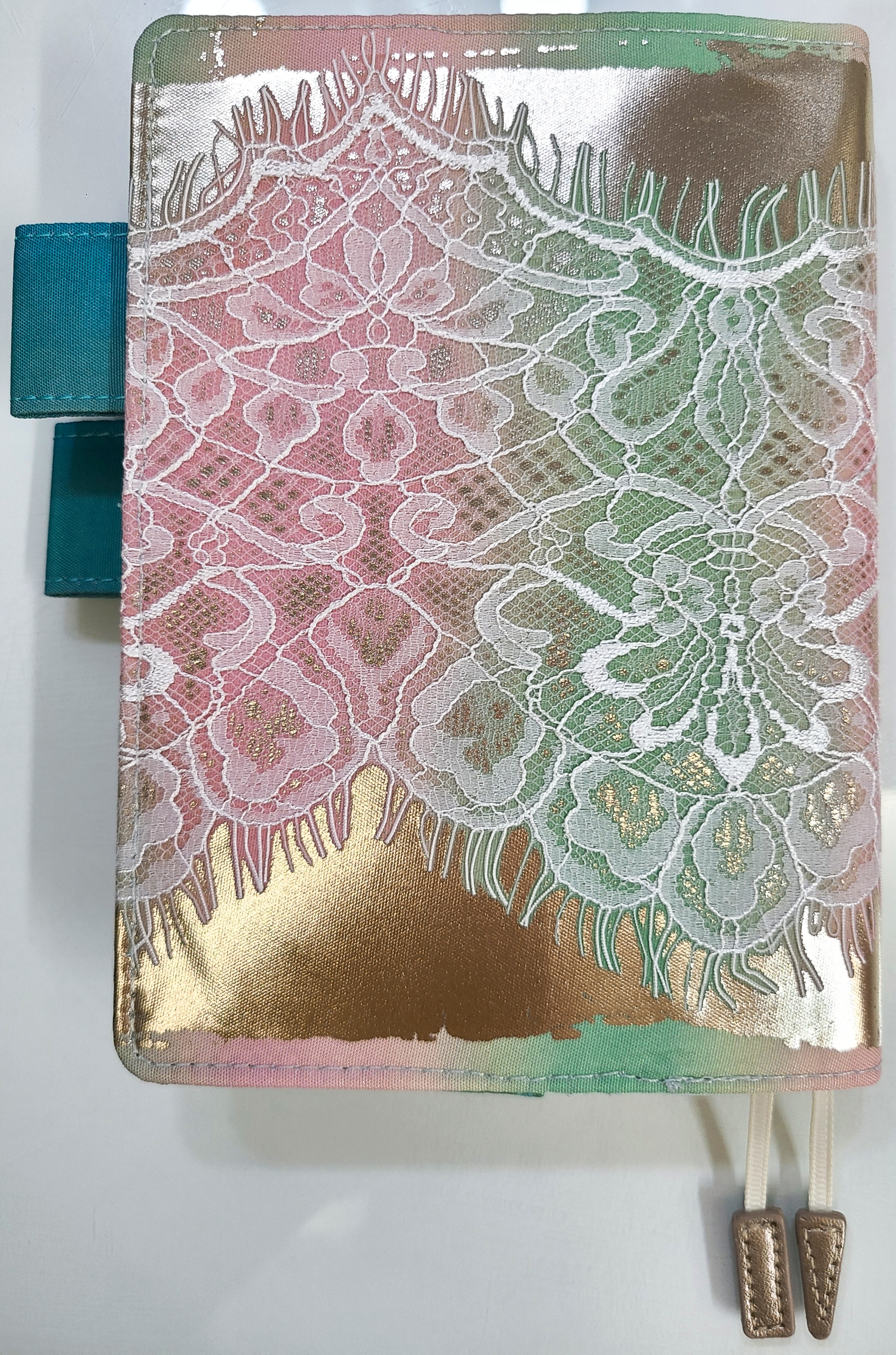 This cover has a base with a gradation of blue, green, and pink like the northern lights, and is overlaid with a delicate lace, and is then further foil pressed with a white gold foil on top of that. The foil sparkles and brings out the presence and three-dimensional look of the lace.