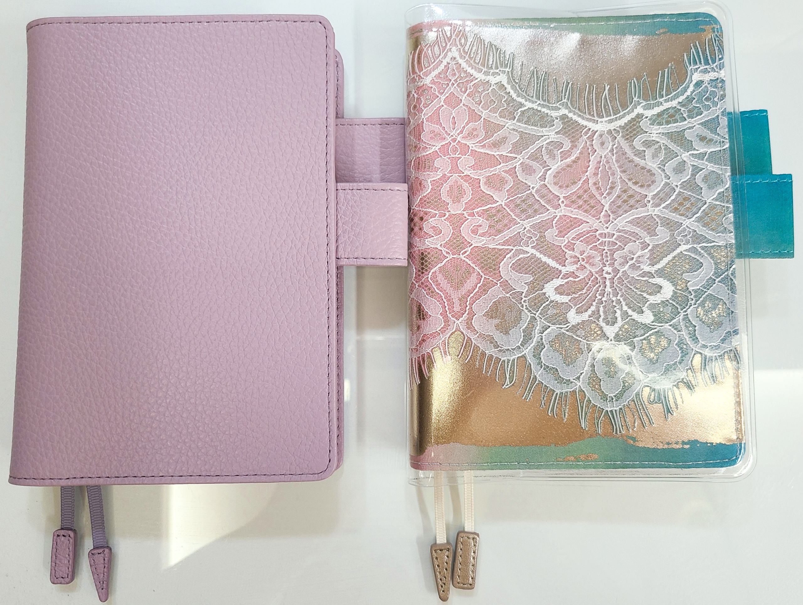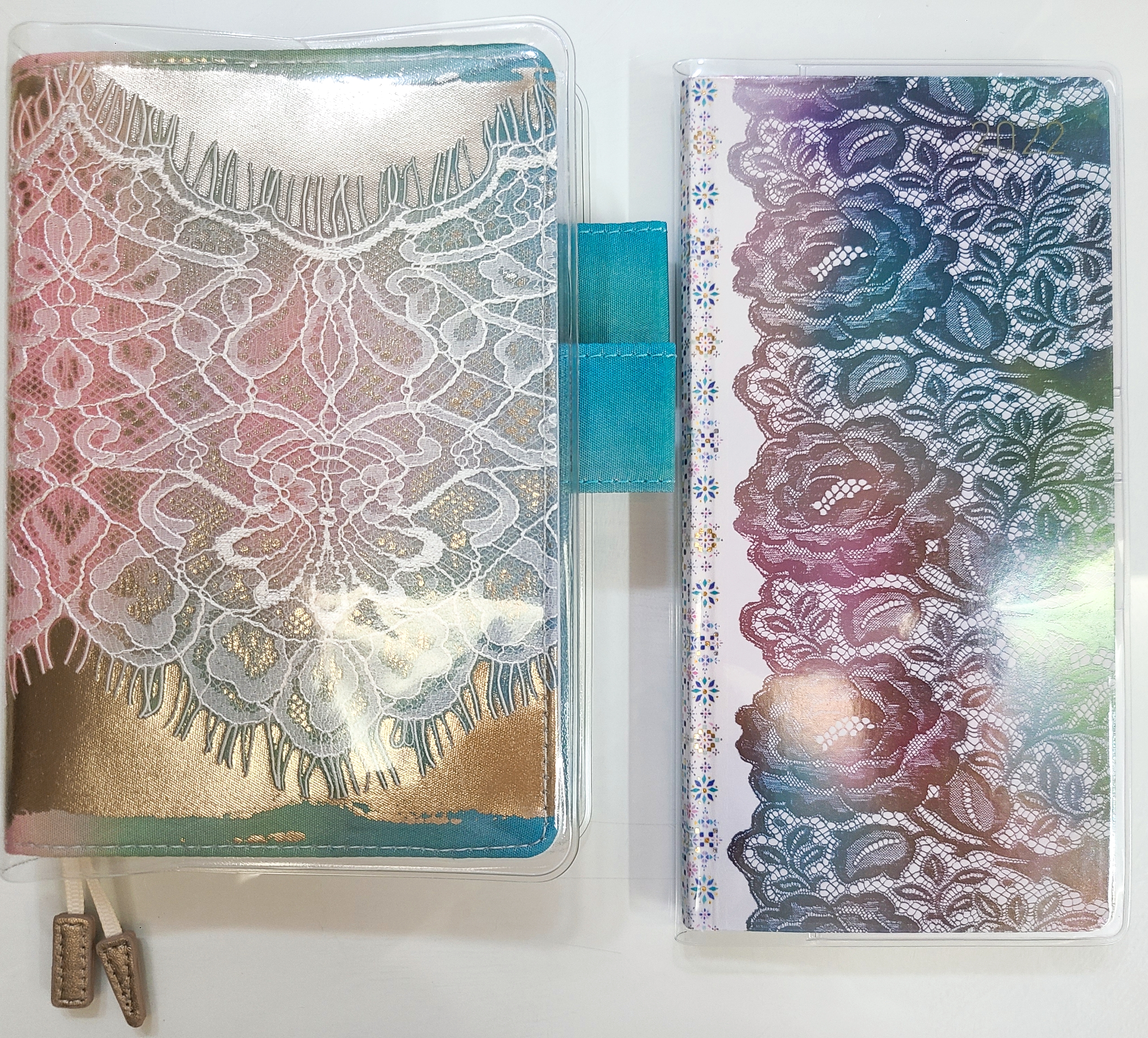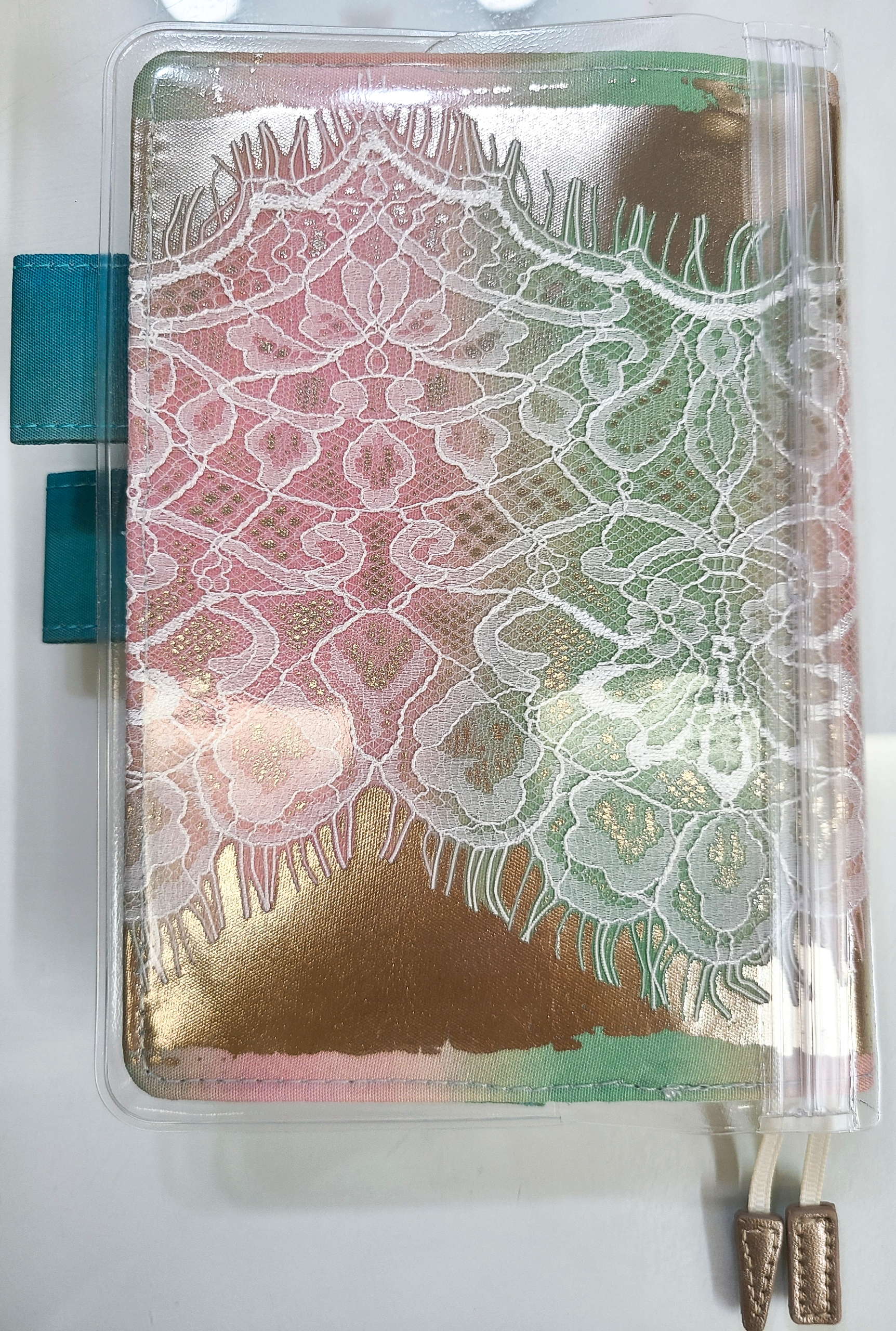 This cover has a base with a gradation of blue, green, and pink like the northern lights, and is overlaid with a delicate lace, and is then further foil pressed with a white gold foil on top of that. The foil sparkles and brings out the presence and three-dimensional look of the lace.