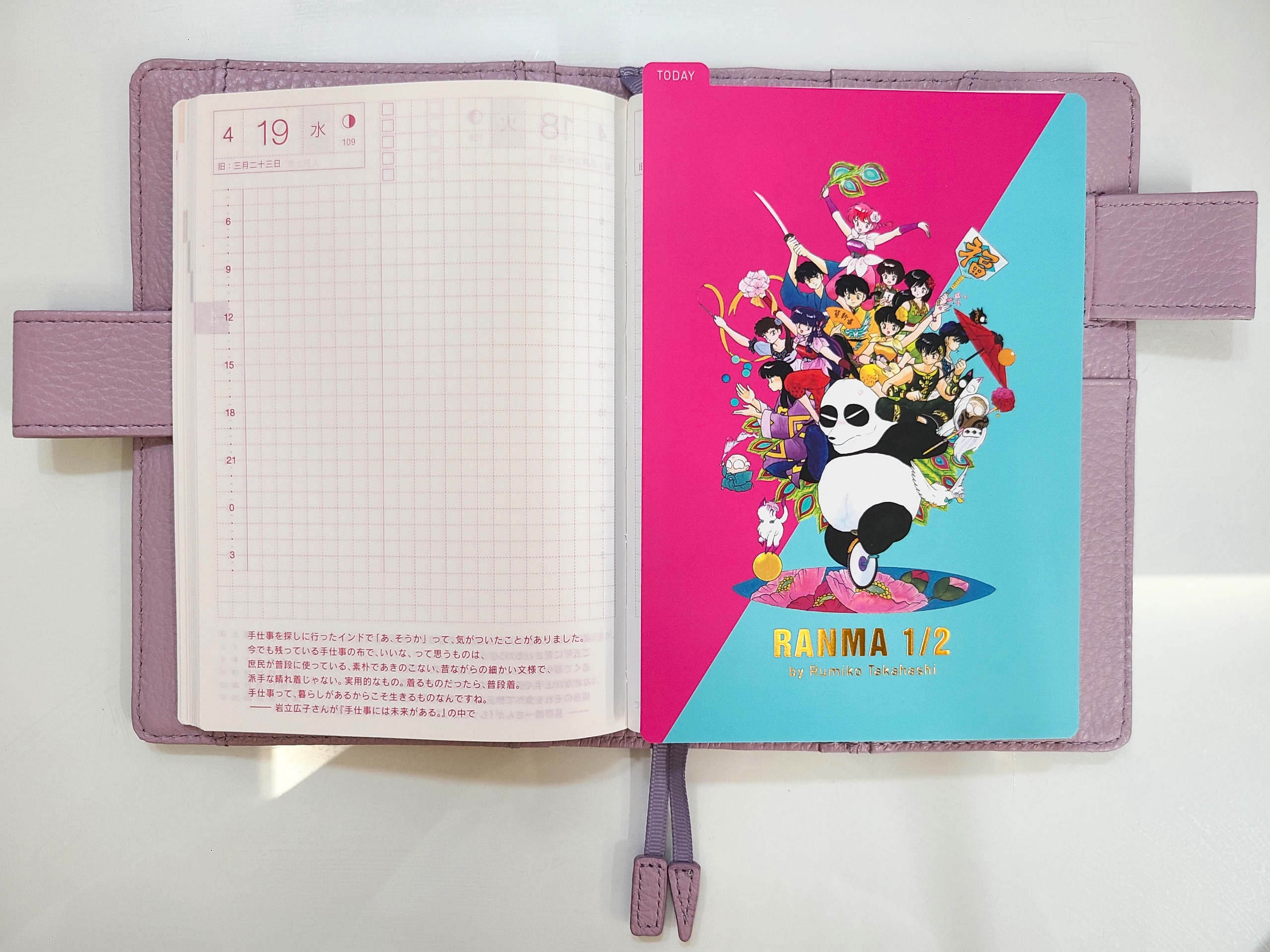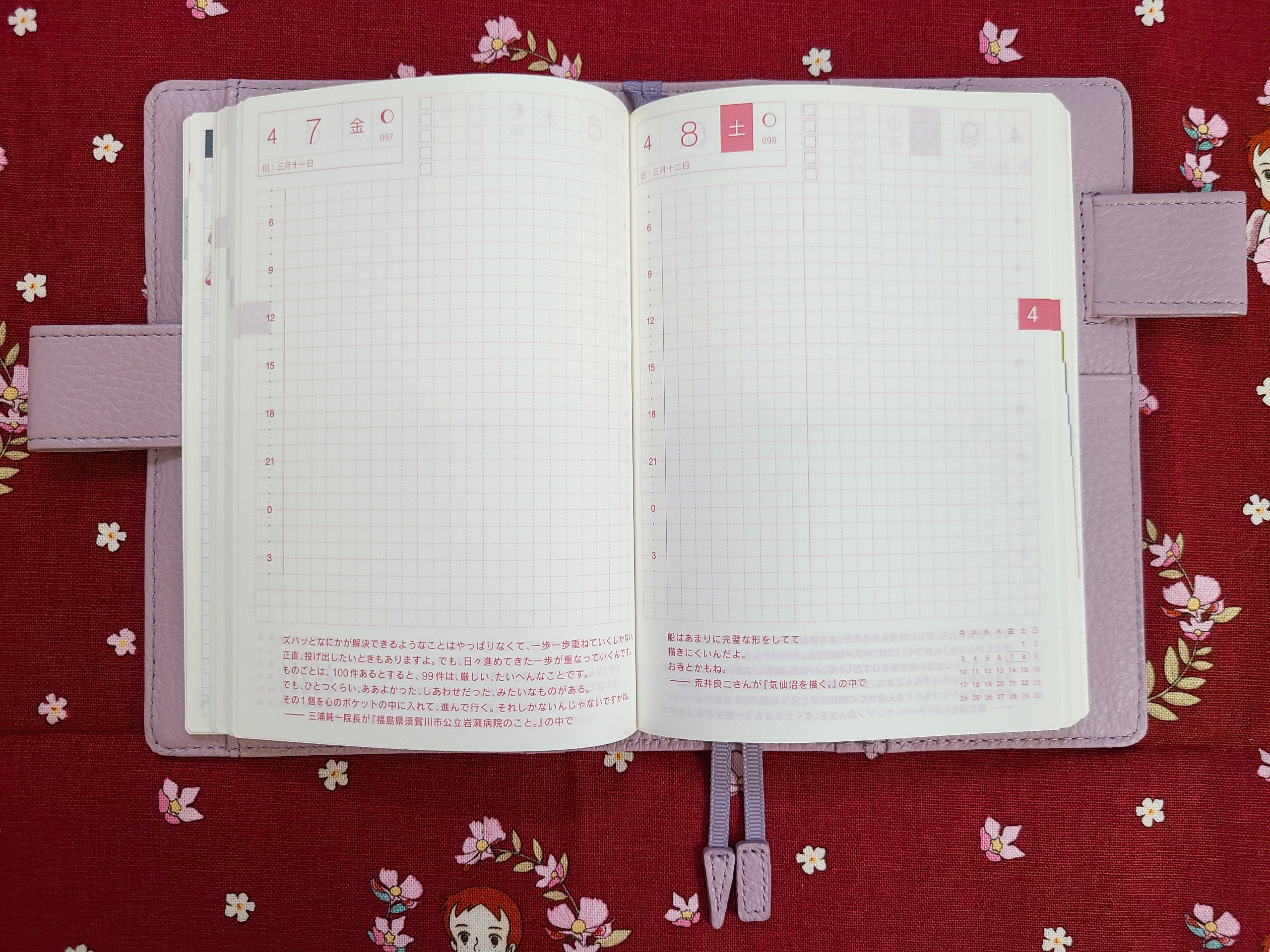 The cover interior uses the same leather, and the card pocket on the bottom right is foil pressed with Hobonichi in silver. The color of the bookmarks is a pale purple.