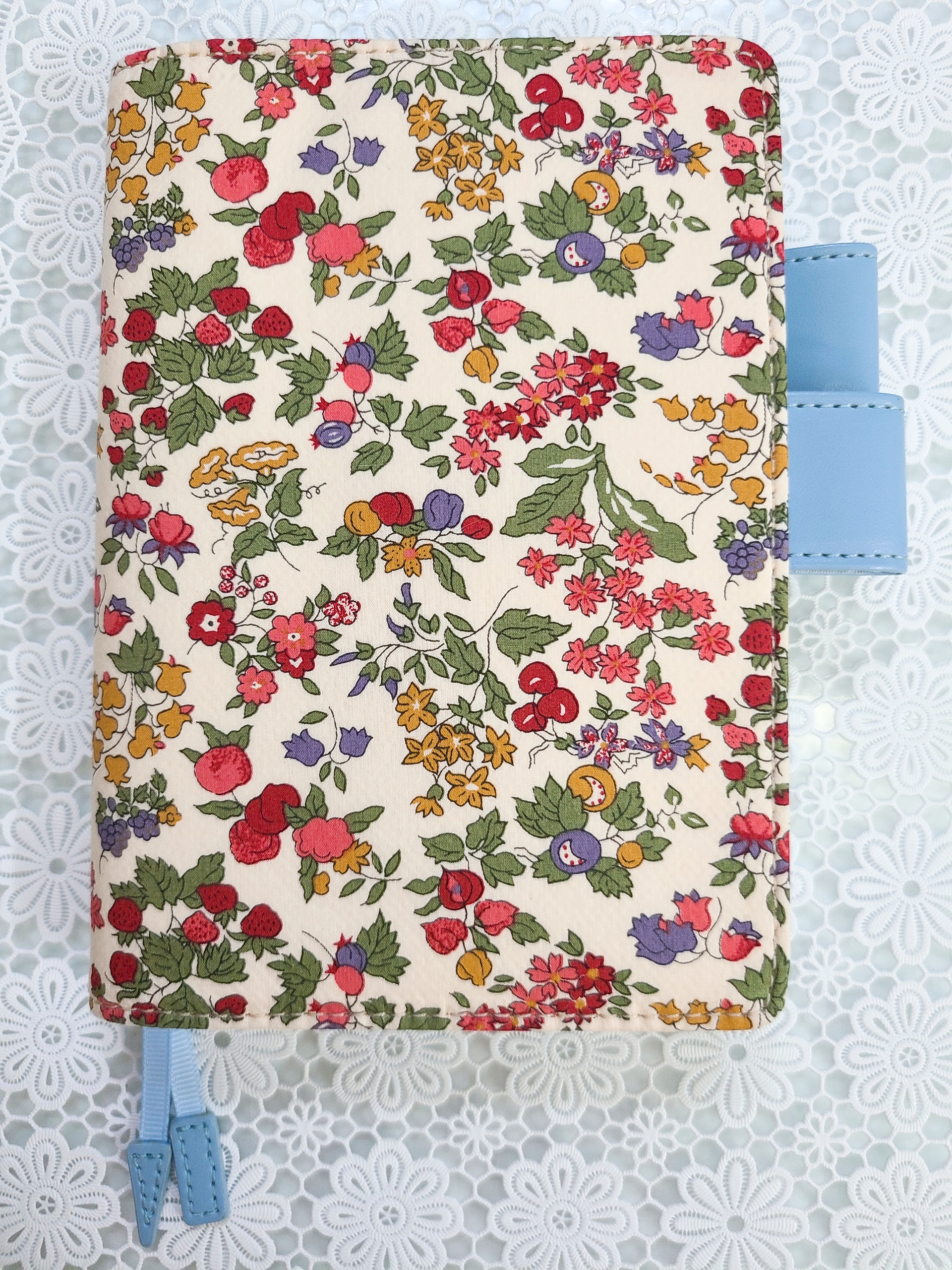 This cover features a beautiful Liberty Print textile from the venerable British fabric brand Liberty Art Fabrics. This bright, fun design, with its colorful flowers and fruits, appears on Liberty Art Fabric’s own "Tana Lawn" material, a meticulously processed cotton fabric with a uniquely silken feel.