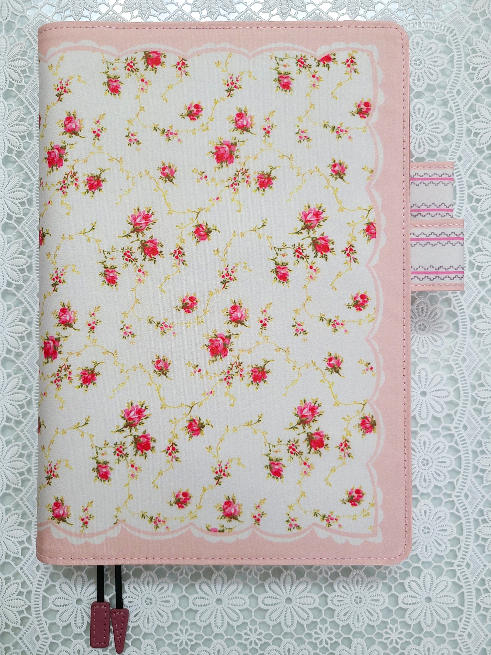 The pink scallop pattern framing the cover brings out the cuteness even more. The “butterfly-stopper” pen holders use a pattern from a different textile.