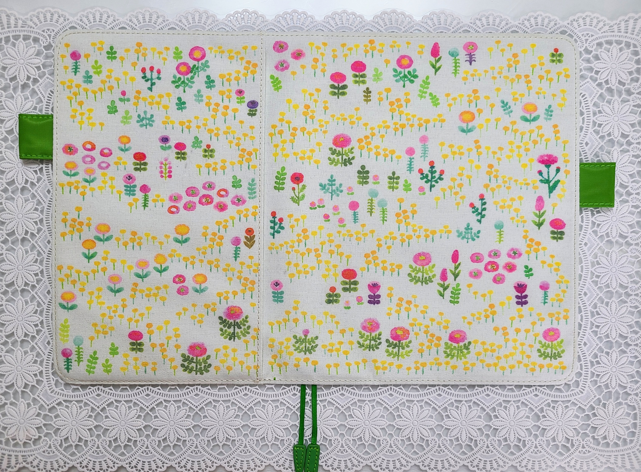 The interior, pen holders and bookmarks are a fresh light green.